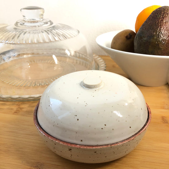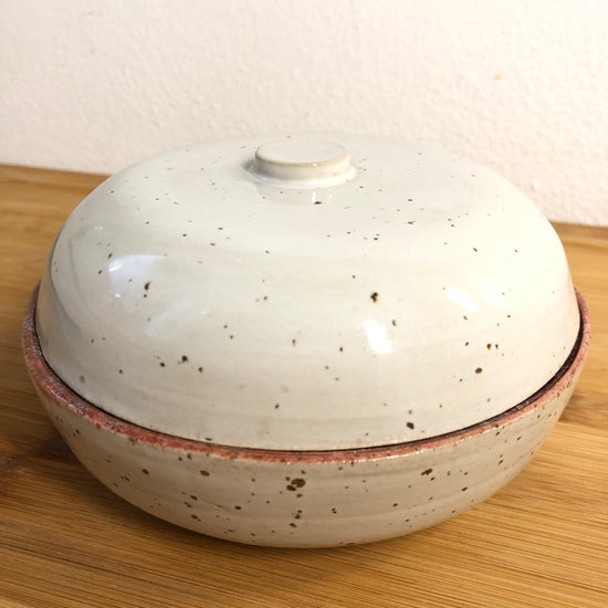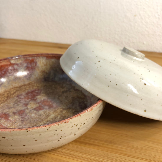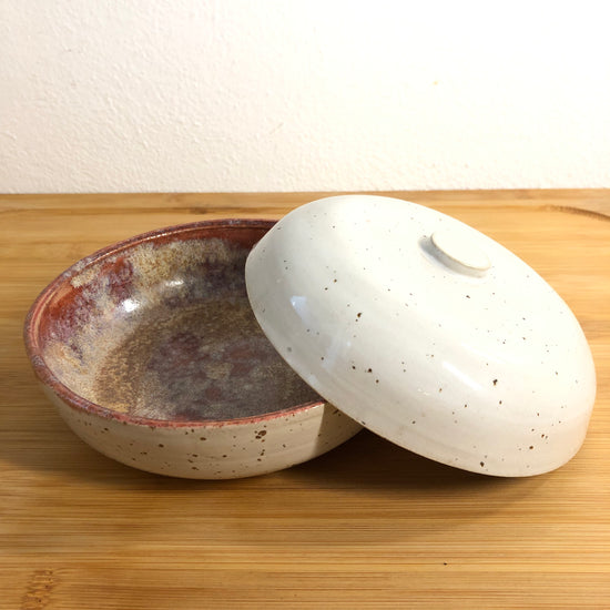 Polished container with cover included, glazed by hand.